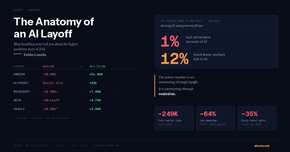Amazon's case is particularly instructive. In 2020 and 2021, the company hired 810,000 people in two years, more than doubling in size. What we are watching now is not AI-driven contraction. It is the cleanup of the most chaotic hiring binge in corporate history.